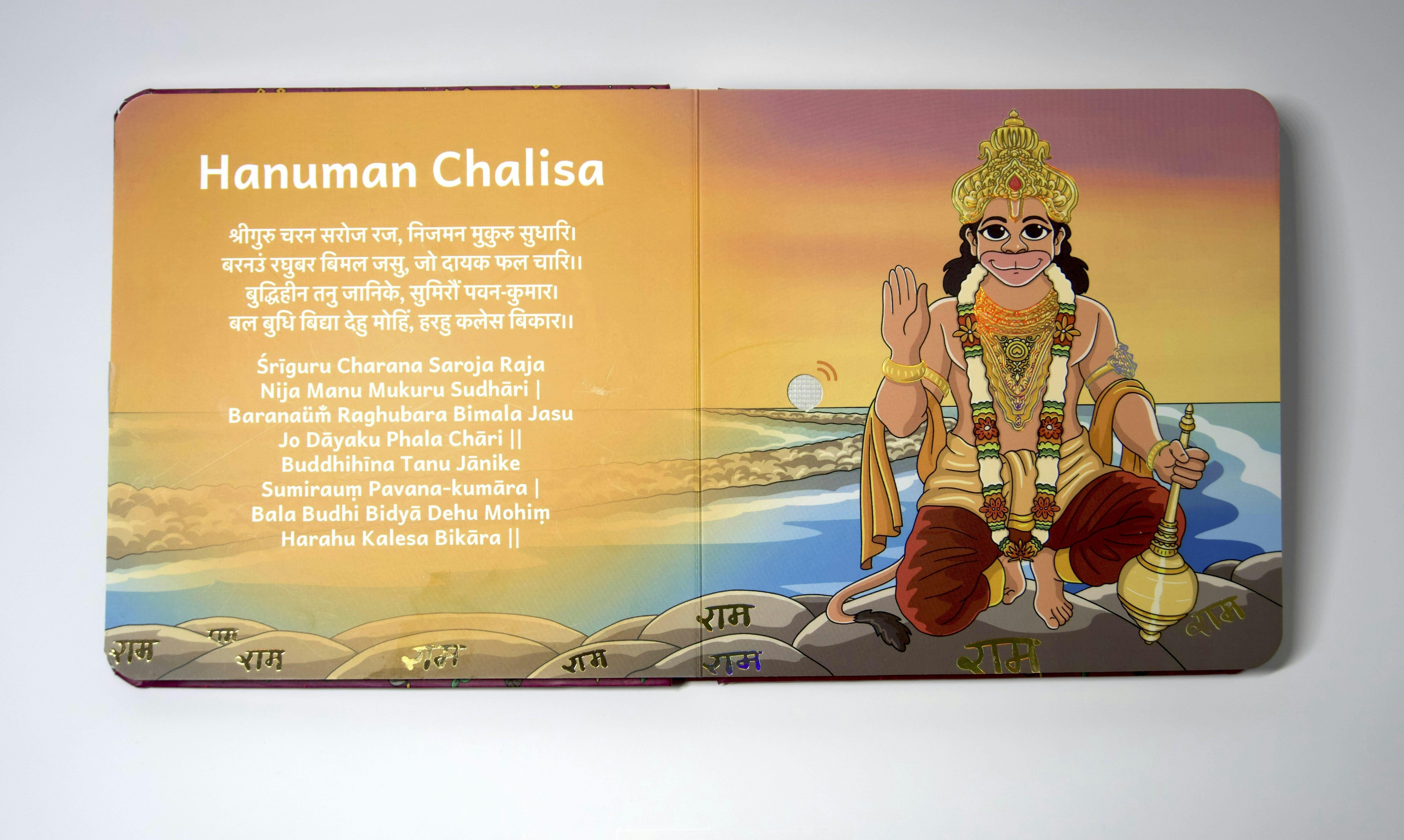 The idea of having a recorded sound play the Shlokas is a big bonus for us, because we can easily sing along the recording while the book is facing the baby and not us (parents). And the babies can learn how to speak the shlokas themselves too!